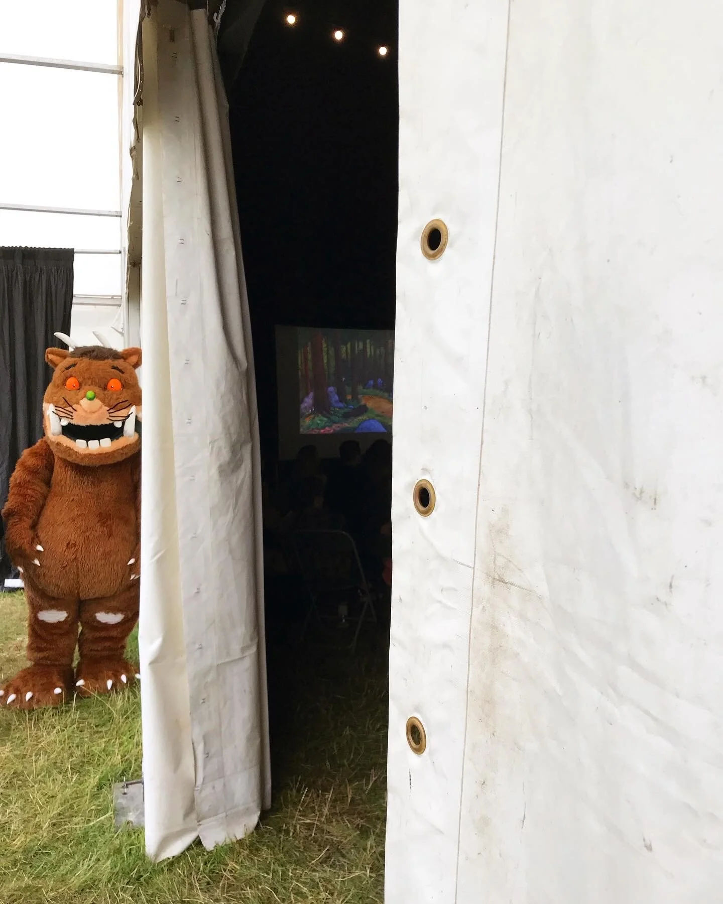 I did not want to bother them, especially before, so I watched and marvelled at the stage being set up, voice testing on the microphone, and costumes being hoisted around, particularly ingrained in my mind is dissected parts of The Gruffalo costume in a cut off part of the tent which I think my childhood self would be traumatised by.